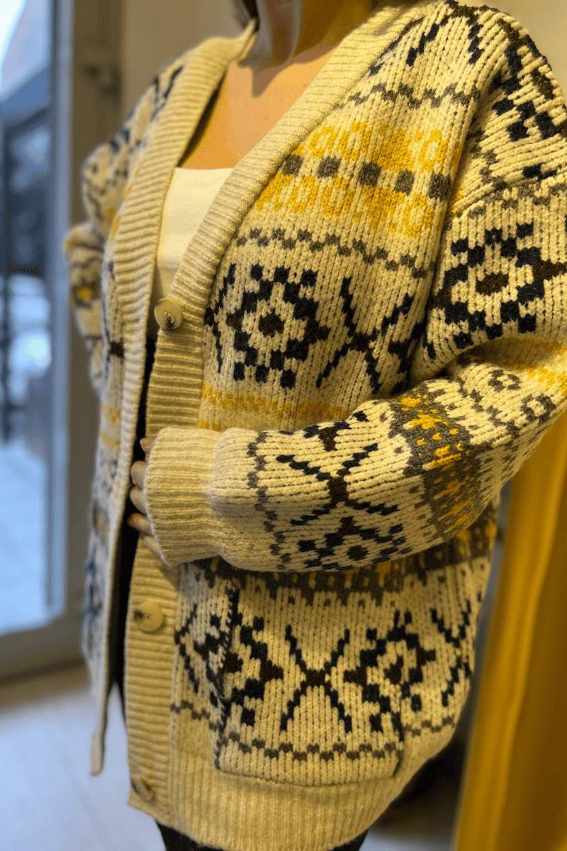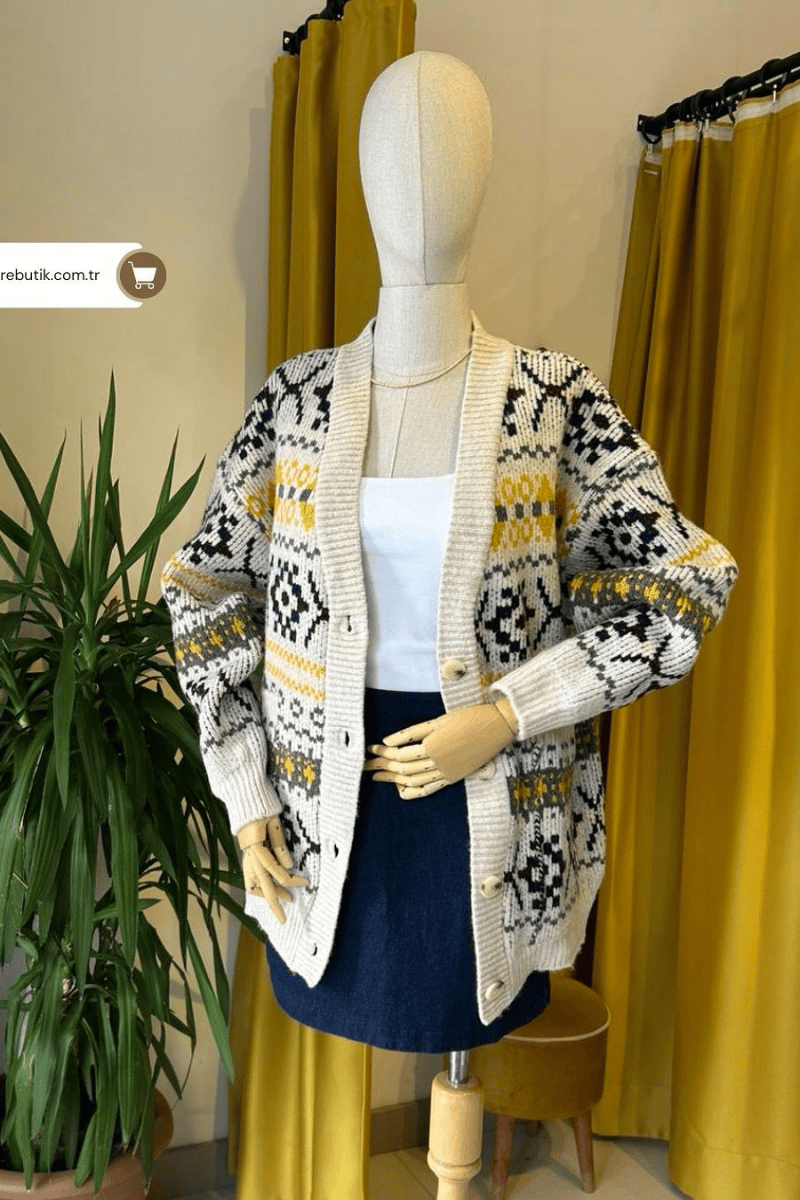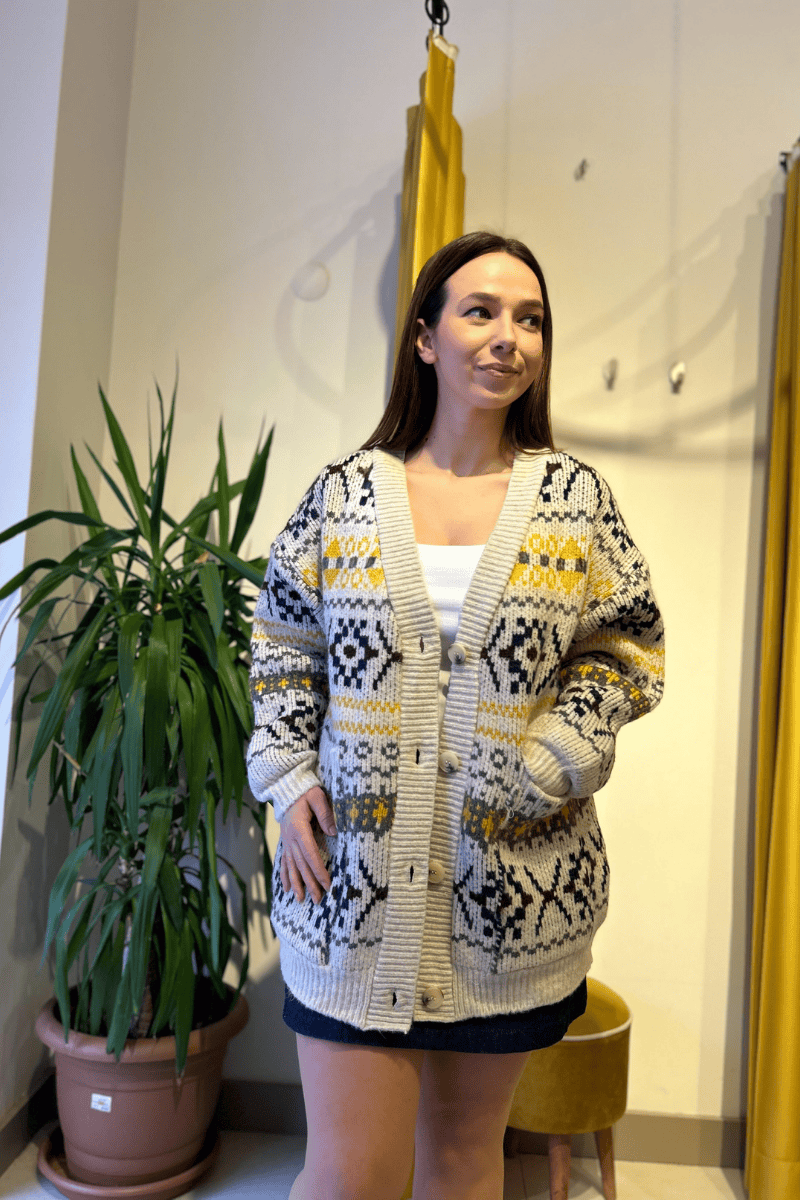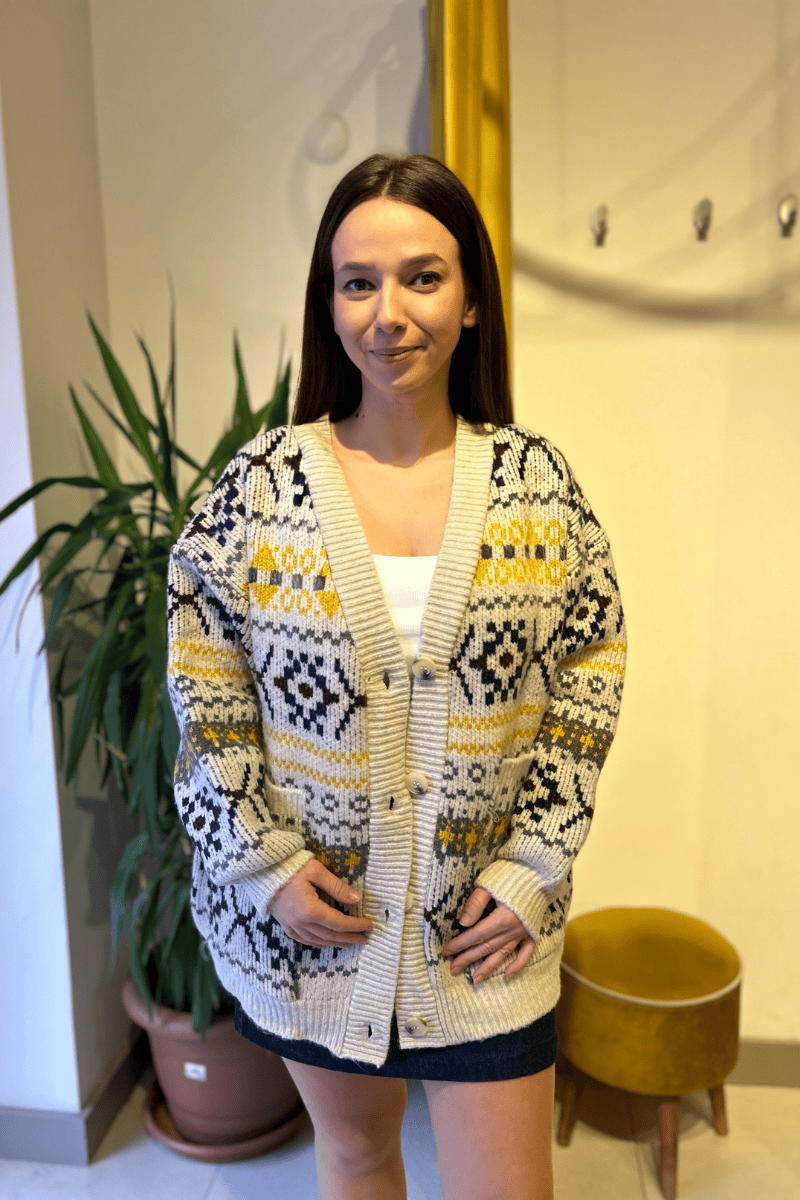 Etnik desenli, kalın ve oversize kesimiyle bu önden düğmeli hırka, kış sezonunda sıcak ve stil sahibi görünüm sunar.
