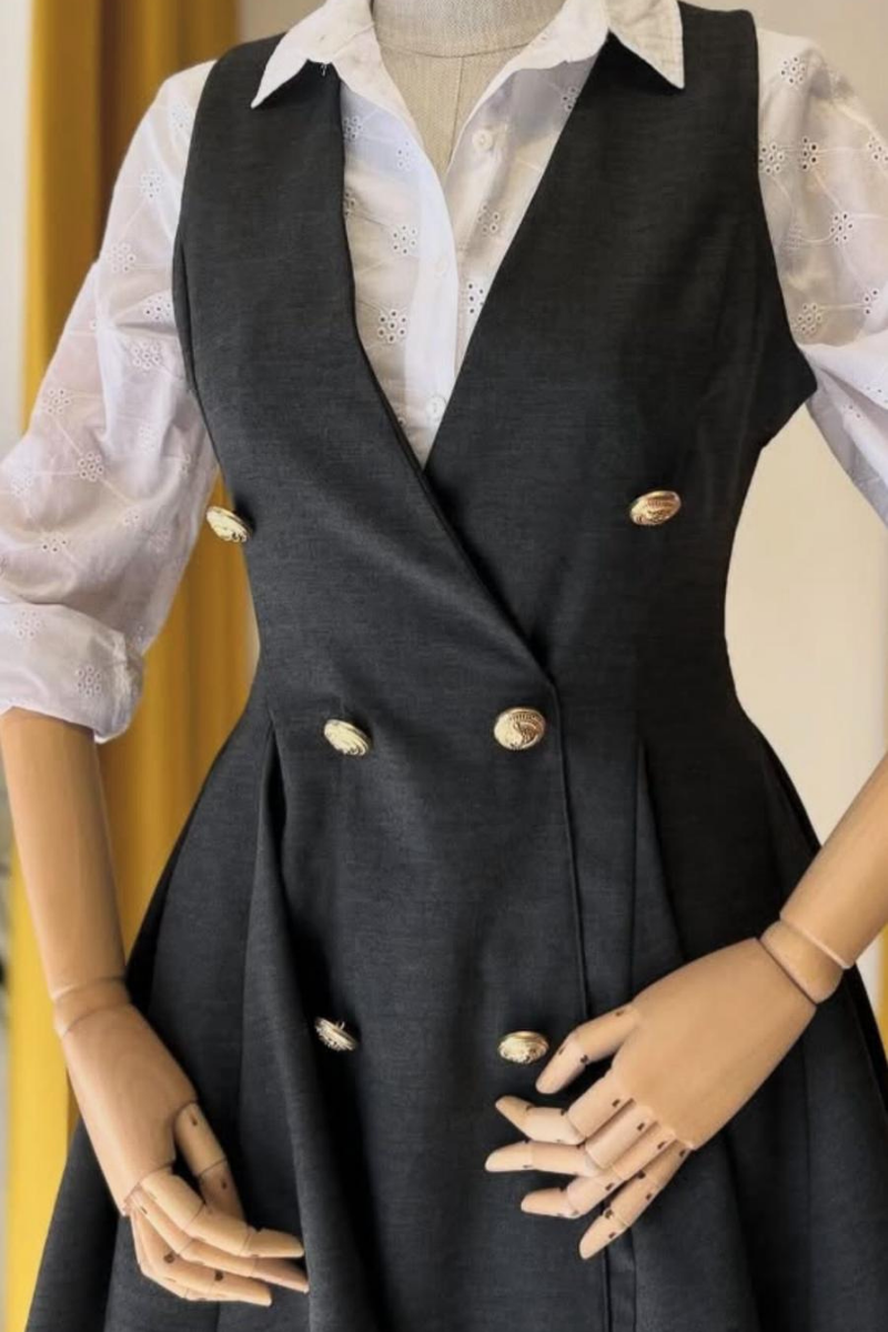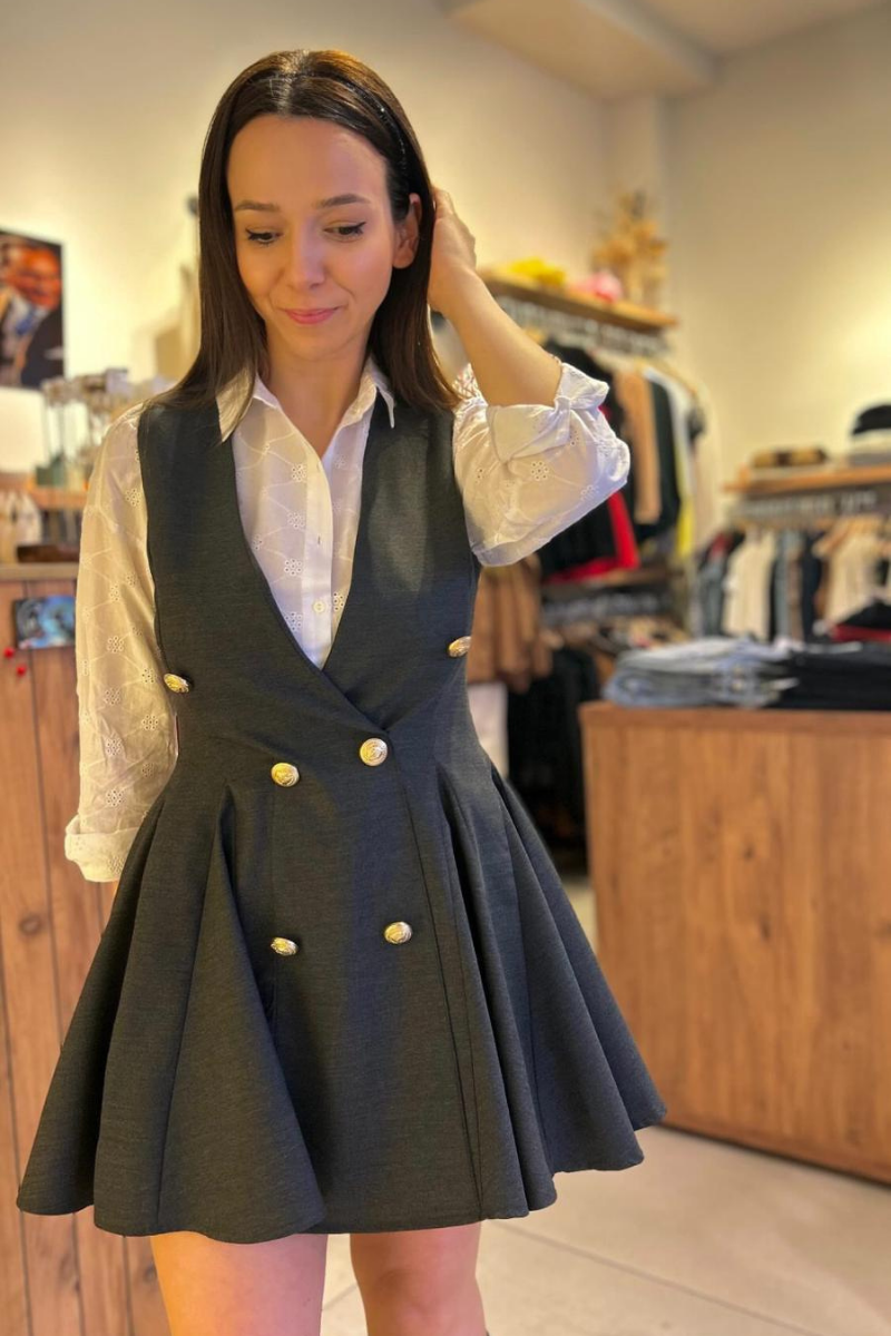 Gri Düğme Detaylı Kloş Mini Elbise