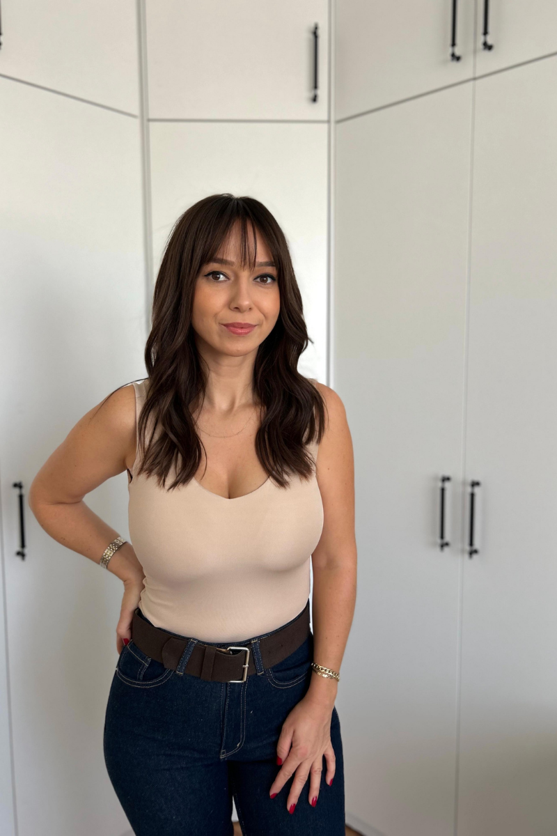Jarse alttan çıtçıtlı bej rengi bodysuit.