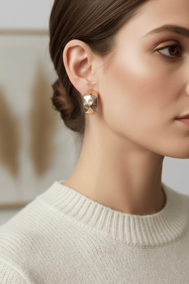Orta boyutta kalın, kesme detaylı halka küpe.