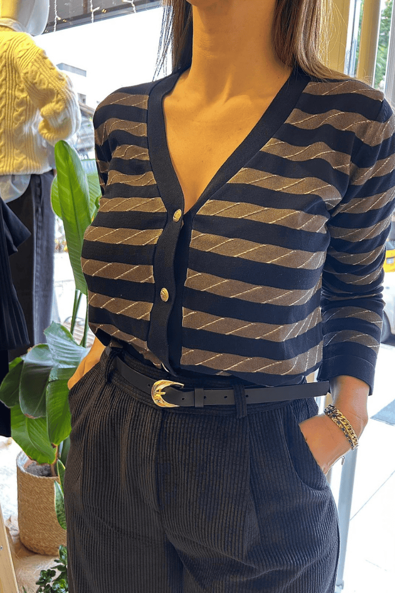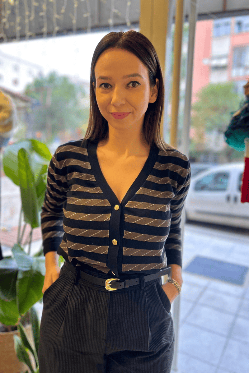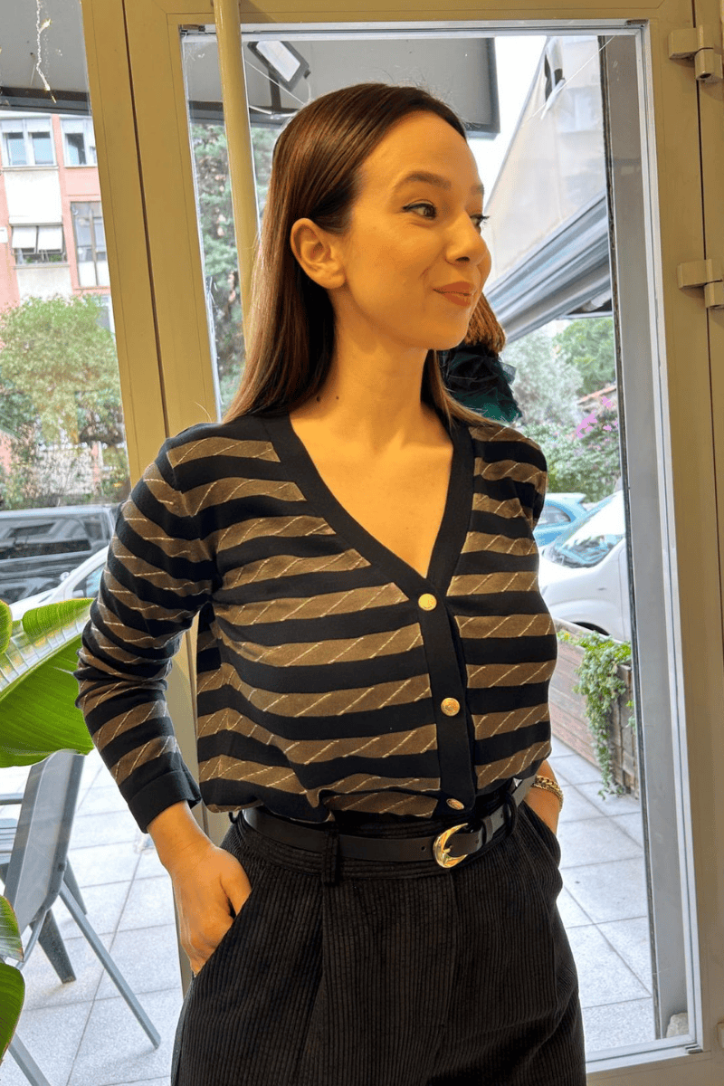 İnce dokulı lacivert bej çizgili önden düğmeli hırka.