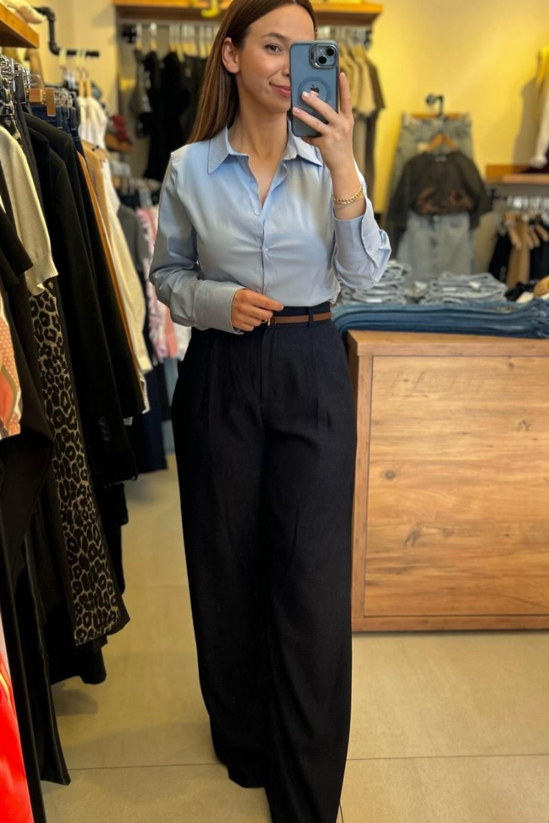 Laci palazzo pantolon. Dökümlü kumaş, beli pensli, önde pile detaylı.