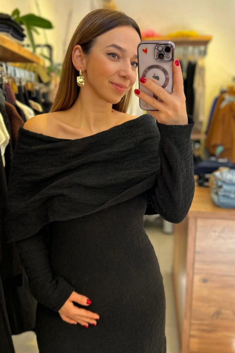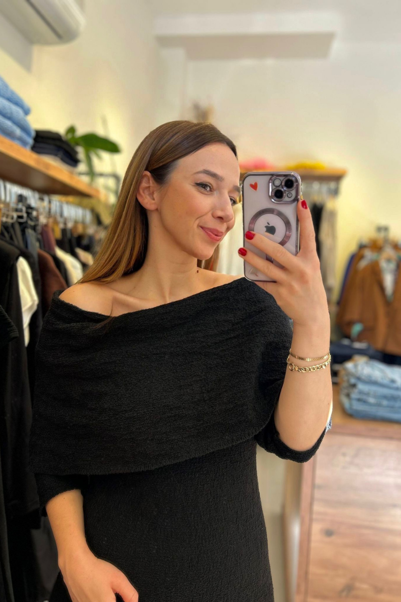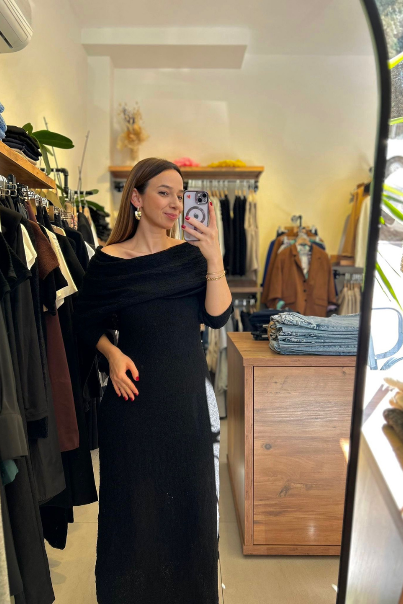 Bürümcük kumaş iç göstermez madonna yaka siyah elbise. Maksi boy. Standart beden.
