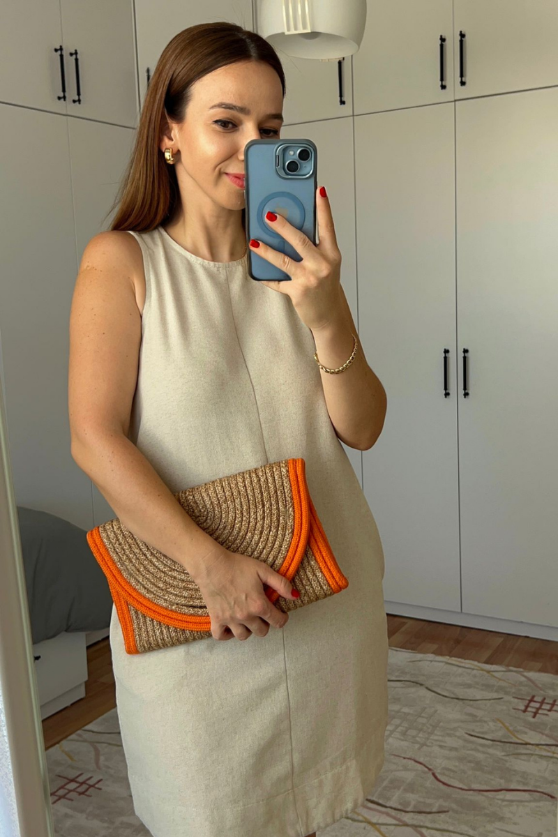 Naturel Renk Sıfır Yaka Kolsuz Keten Elbise.