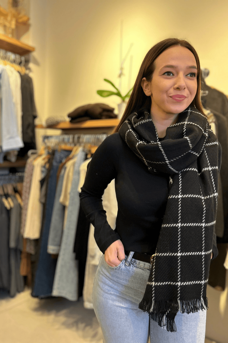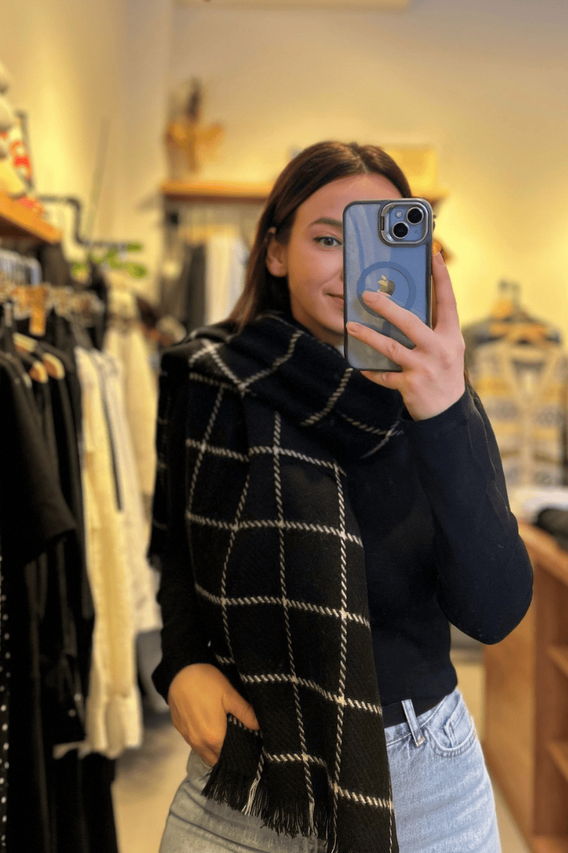 Yumoş atkı şal çeşitlerimizden siyah üzeri kareli desen yılın trendleri arasında.