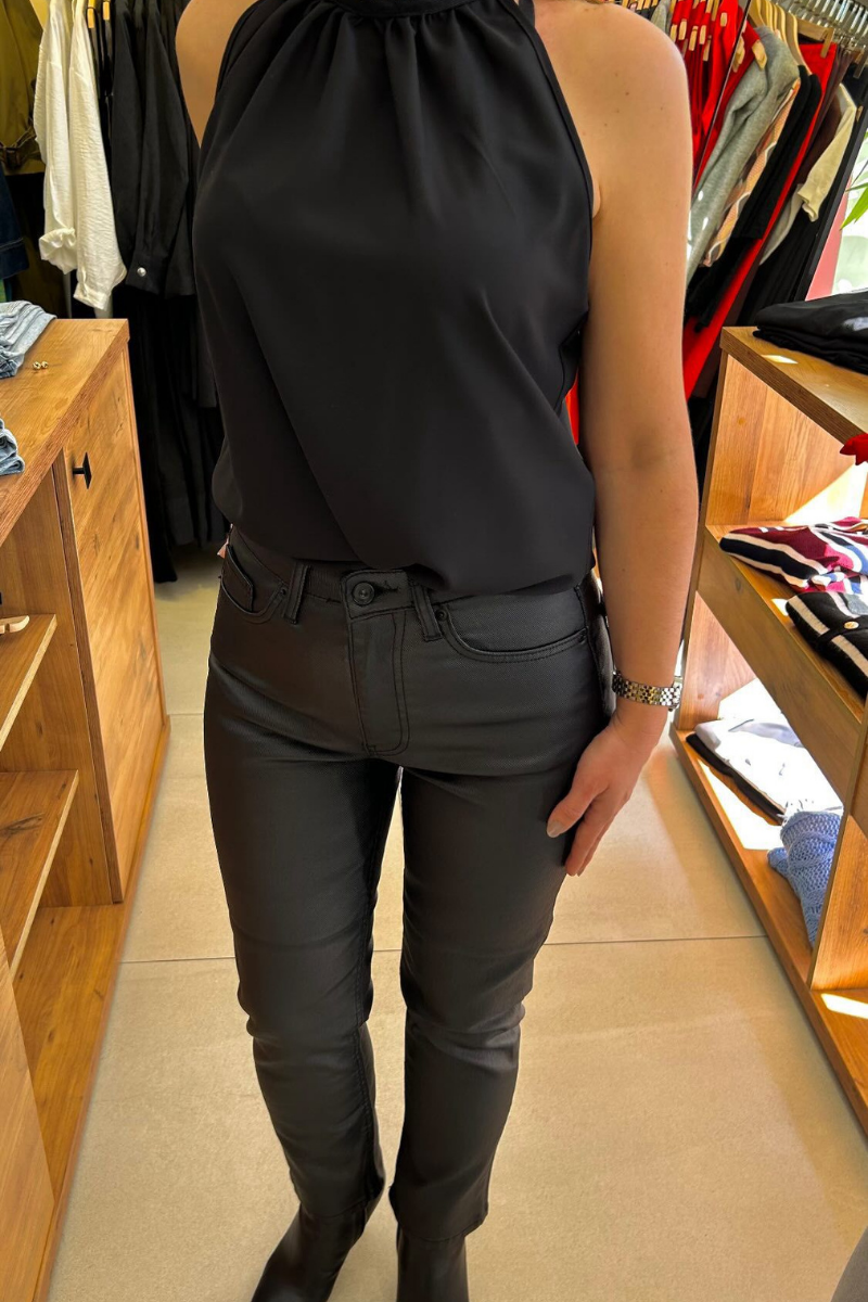 Siyah dar kesim dar paça mumlu kaplamalı pantolon.