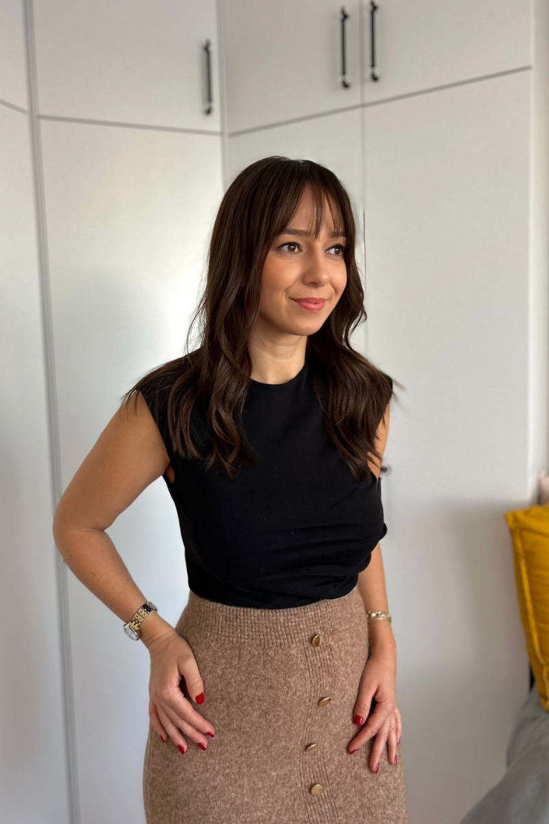 Siyah Önü Drapeli Düşük Kol Sıfır Yaka Body