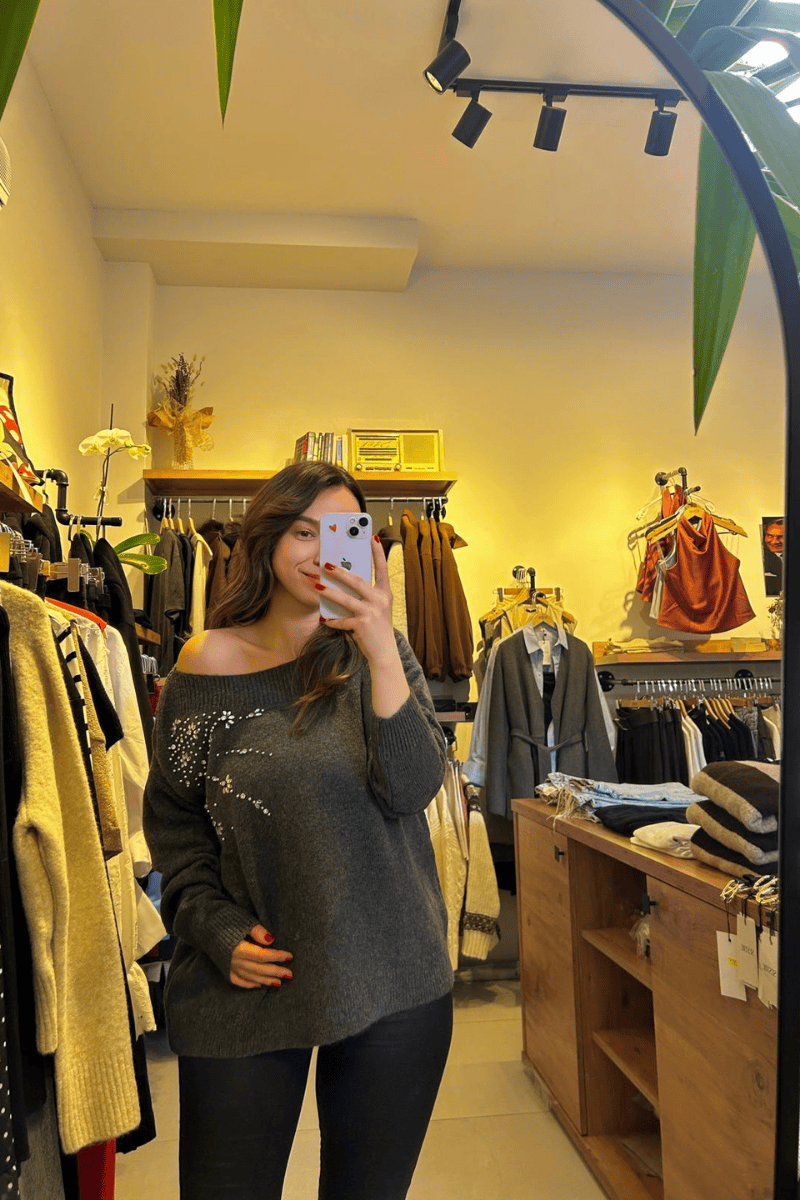 Düşük omuz taş işleme detaylı koyu gri kazak.