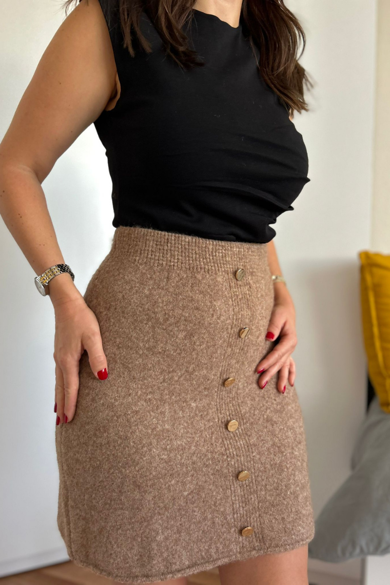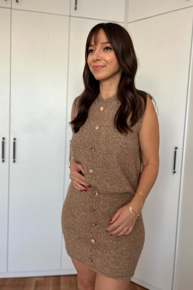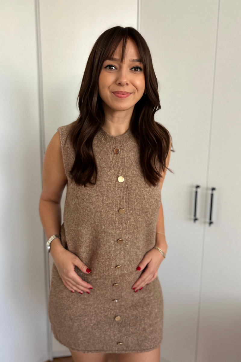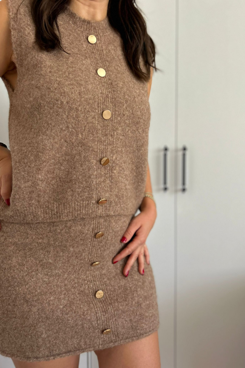 Taş rengi gold düğme detaylı kaşmir dokulu kolsuz takım.