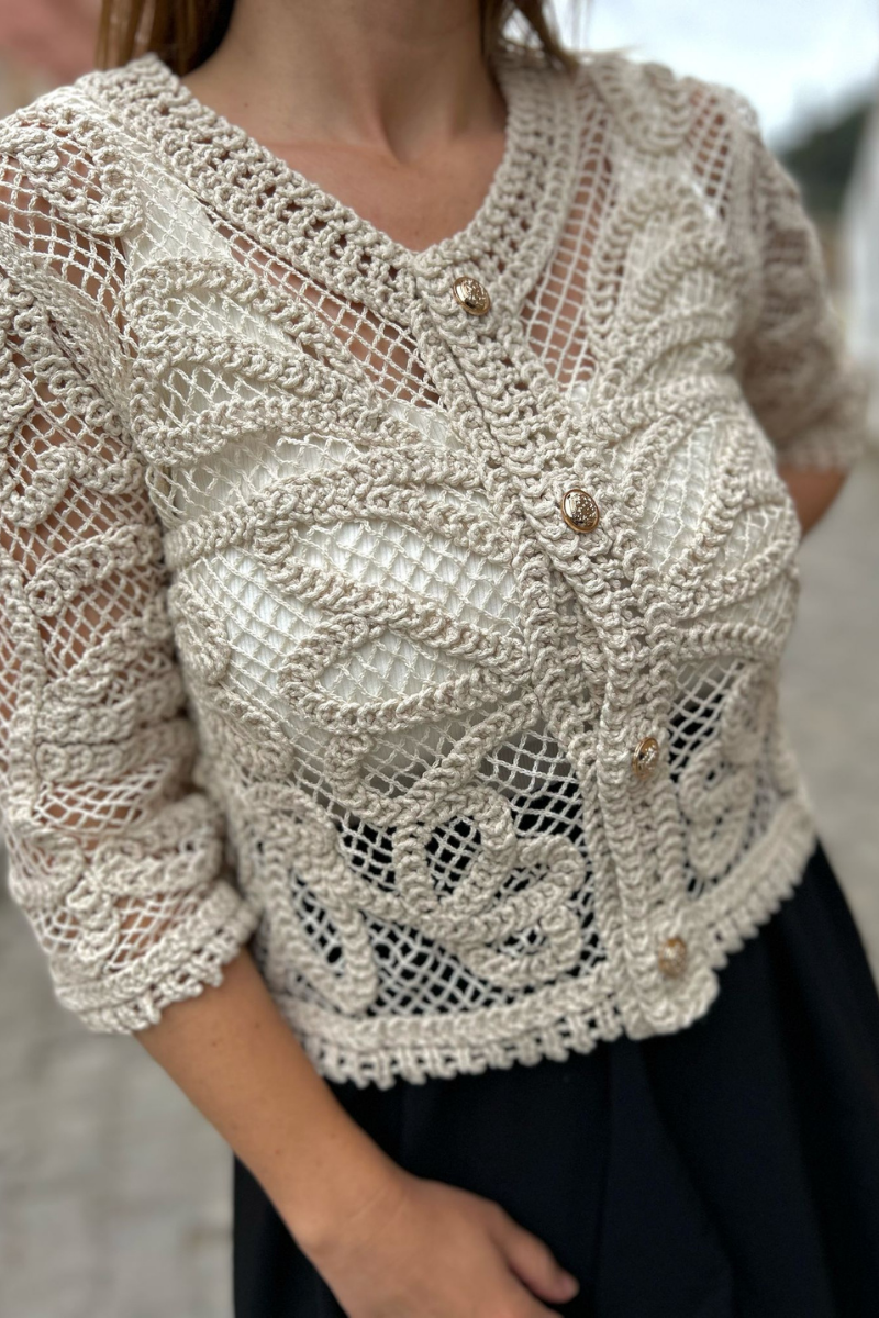 Bu doğal tonlardaki hırka, tığ işlemeli detayları ve romantik esintisiyle dikkat çekiyor. Tığ işlemeli naturel tonajdaki hırkamız rahat kesimi ve dirsek kol uzunluğu ile şıklığı rahatlıkla bir araya getiriyor.