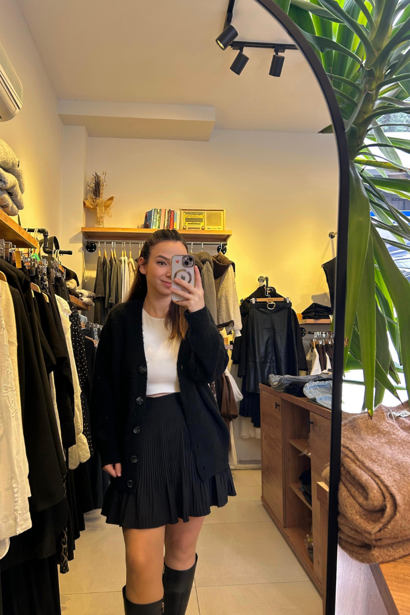 Oversize kalıp, kalçada biten standart beden hırka. Yumuşak dokulu rahat kesim.