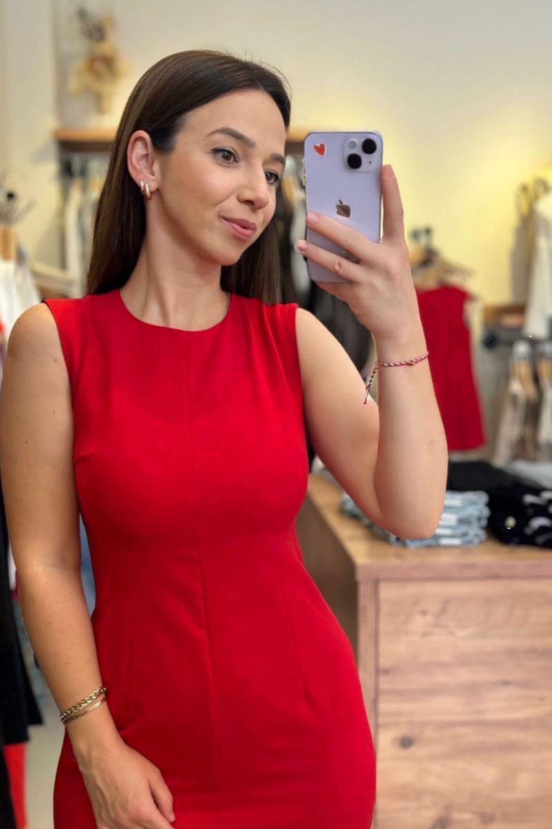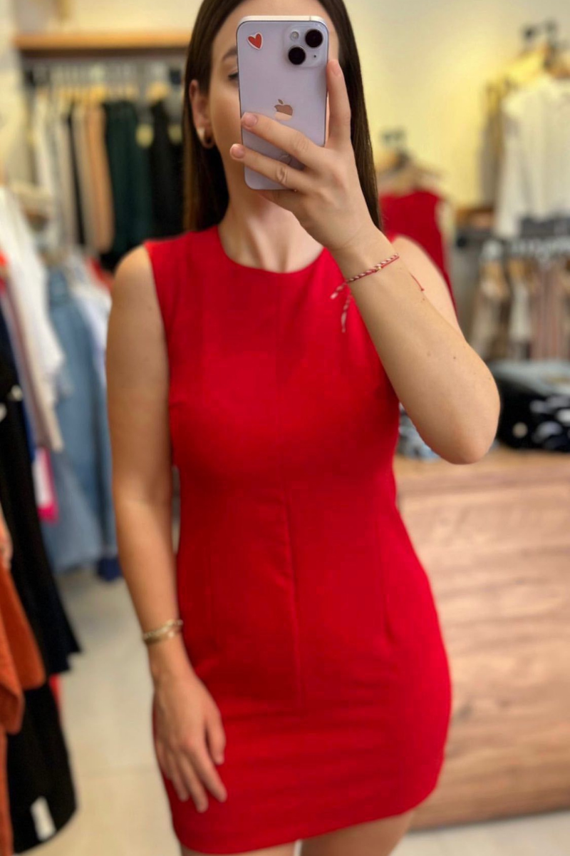 Elbise kalıbı balık formlu vucudu sarar. Süper mini boy bayrak kırmızısı elbise.