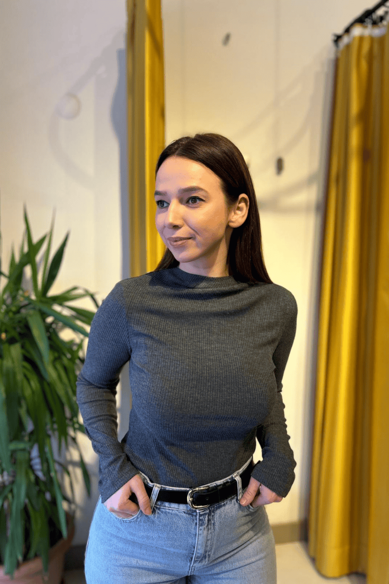 Yarım Boğazlı Drape Detaylı Fitilli Gri Body